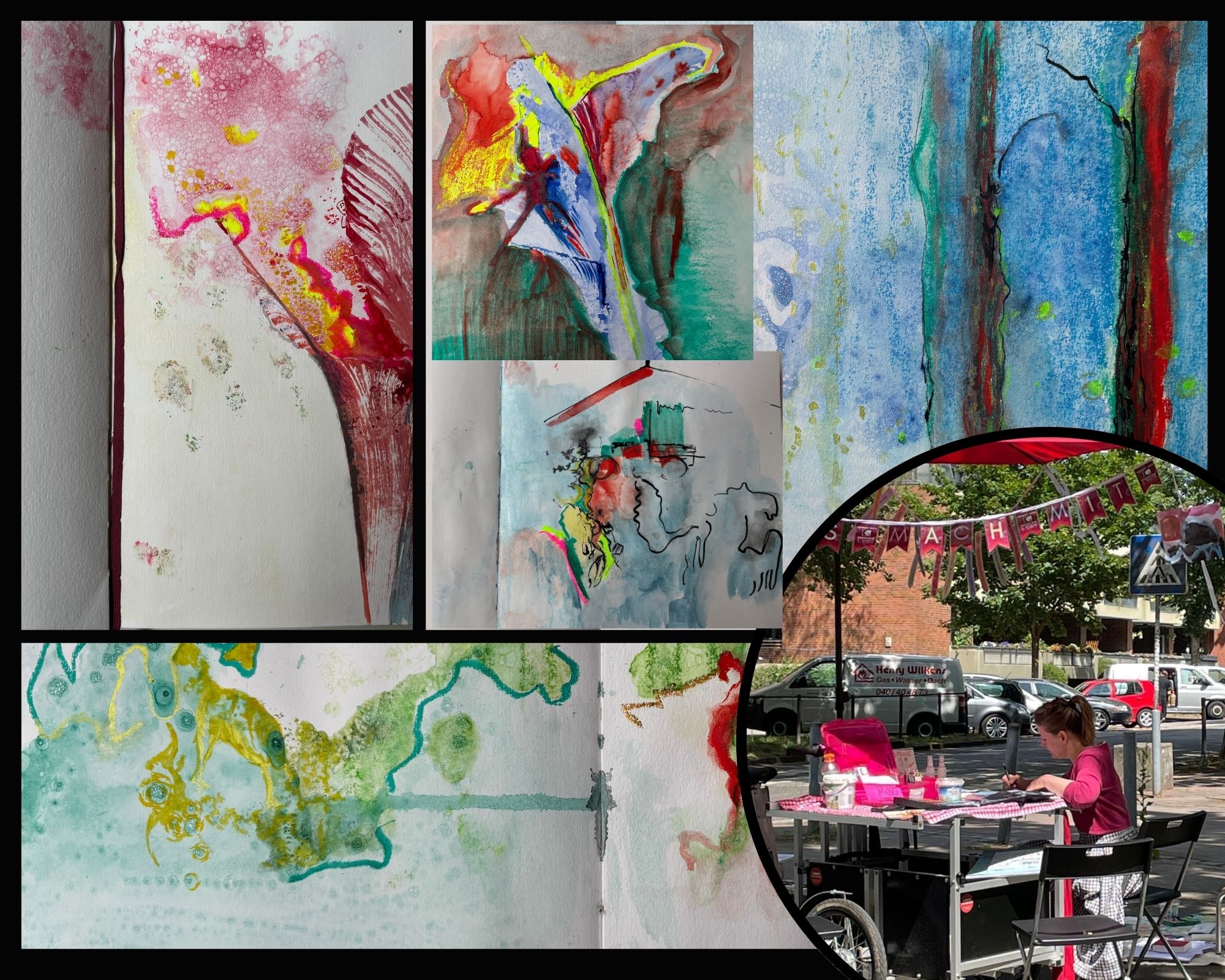 Ich zeichne nämlich immer während der Angebote und probiere neue Techniken aus oder lasse mich von meinen Gefühlen treiben, welche in mir während der Aktionen am Lautesten sind. Ich erhebe dabei keinen Anspruch auf Perfektion, strebe ganz im Gegenteil davon weg und versuche, das, was ich auch meinen Besucher:innen vermitteln möchte, selber in meinem Zeichenvorgang zu praktizieren – Wertfreiheit, Entspannung, eine gewisse Form der Ziellosigkeit, die sich auch fokussieren kann, die inneren harten Kritiker:innen zu besänftigen, die mich so unter Druck setzen können, dass mir ein leeres Blatt Angst macht oder jeder Strich, jede Linie, jede künstlerische Entscheidung destruktiv zerrissen werden. Ich versuche mich selber davon zu lösen und in der Freude, der Leichtigkeit und im Genuss des Tuns zu bleiben. Wenn mir das gelingt, kann ich glücklich tätig sein und es entsteht einfach, was gerade da ist. Manchmal hebe ich danach den Blick, gehe ein paar Schritte in Distanz und staune über das Ergebnis – und finde es selber sogar gut. Wenn das passiert, erlebe ich ein Hochgefühl, das selbst die immerwährend zeternden inneren Stimmen der Kritik zum Schweigen oder sogar zu Lauten des „Ohs“ und „Ahs“ bewegen können. Dann bin ich dankbar, dass ich durchgehalten, mir selber kein Bein gestellt und an mich geglaubt habe – bei jeder noch so läppischen Zeichnung!