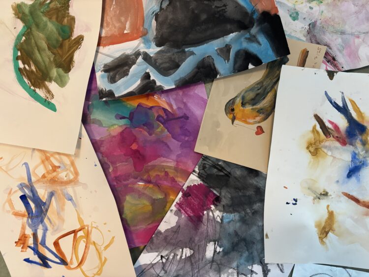 Zurück zu dieser Dame. Sie ist die personifizierte Kritik im Außen, die sich langsam anschleicht und von der Seite heranrückt, ganz nah an mich herantritt, mir prüfend aufs Blatt stiert – und dann – ihren Mund verzieht. Ich bin irritiert, rücke etwas ab, und frage sie auch noch, was sie denkt, weil ich die direkte Kommunikation bevorzuge. Allerdings habe ich sie damit wohl eher eingeladen, meine Weichheit beiseite zu drücken, meine Verletzlichkeit laut anzubrüllen und mit dem erhobenen Zeigefinger auf meine innerlich grinsenden Kritiker:innen zuzugehen. Die Sätze:“ Das beißt sich, das ist nicht gelungen, das ist ja furchtbar, warum haben sie das denn so gemacht?“ peitschen mich aus, während sie mit ihrem Finger auf meiner Zeichnung hin-und herwischt. Ich schaue sie mit großen Augen an. Versuche mich zu schützen, indem ich ihr sage, dass ich sie als sehr streng empfinde und sie frage, ob sie selber zeichne. Sie bejaht und versucht mir gleichzeitig den Pinsel aus der Hand zu nehmen, um meine unsäglichen Fehler im Bild zu reparieren. Ich ziehe meine Hand weg, rufe ein NEIN aus und verweise darauf, dass dies doch Skizzen und Übungen seien und sie doch bitte eine eigene Arbeit anfertige solle, bevor sie mit den Fingern in meiner rumrühre und mir meine Arbeitsproben ins Nichts rede. Sie verneint, dass sie dazu keine Lust habe und zieht von Dannen.